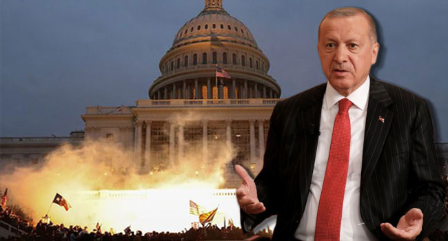 وادعى أردوغان تواصل مدبري اقتحام الكونغرس الأمريكي بوحدات حماية الشعب الكردية، النواة الأساسية في قوات سوريا الديمقراطية، مفيدا أن اقتحام الكونغرس الأمريكي كشف مرة أخرى أن الإرهاب معادٍ للإنسانية والديمقراطية.