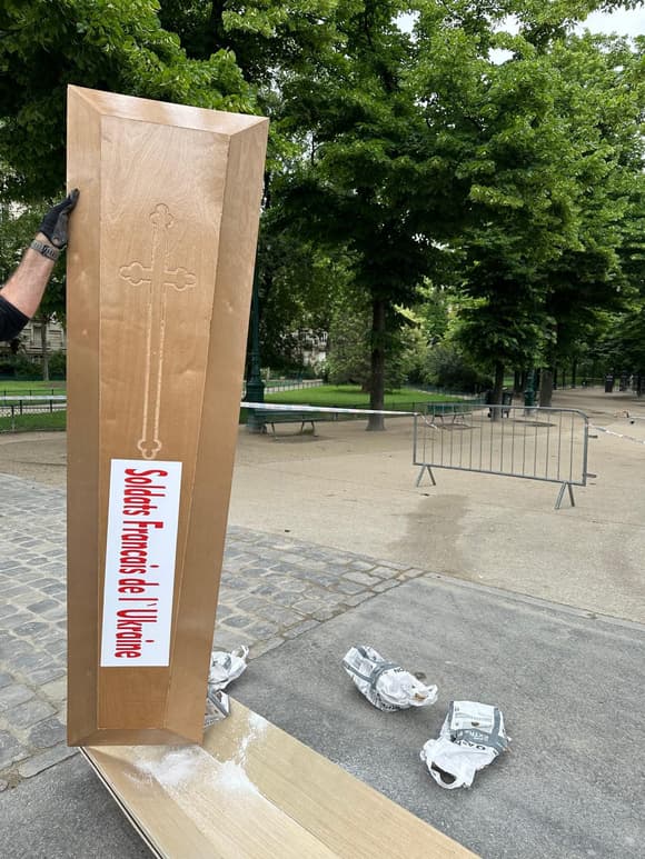 باريس (زمان التركية)ــ أوقفت الشرطة الفرنسية ثلاثة أشخاص لوضعهم خمسة توابيت بالقرب من برج إيفل في العاصمة باريس، وكانت النعوش مغطاة بالأعلام الفرنسية وكُتب عليها “القوات الفرنسية في أوكرانيا”.
