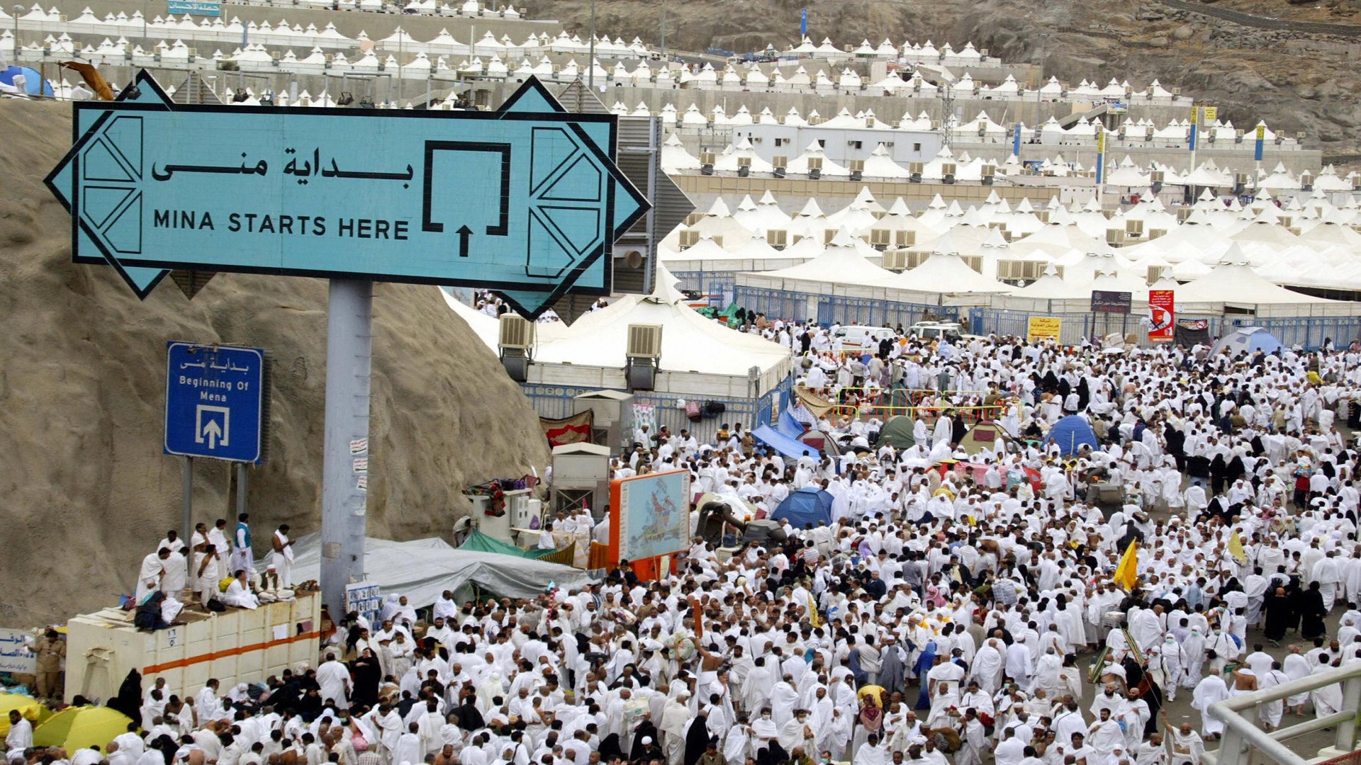 MECCA, SAUDI ARABIA: Muslim pilgrims arrive to take part in the "Stoning of Satan" ritual of the annual hajj pilgrimage at one of the "jamarat", or three pillars symbolising the devil, 20 January 2005 in Mina, near Mecca. According to tradition, it is the place where Satan appeared first to Abraham, to his son, Ishmael, and to Ishmael's mother Hagar. All three pillars are to be stoned as the ritual resumes on Friday and Saturday, as the Islamic world marked the Eid al-Adha feast of sacrifice. AFP PHOTO/KARIM SAHIB (Photo credit should read KARIM SAHIB/AFP/Getty Images)