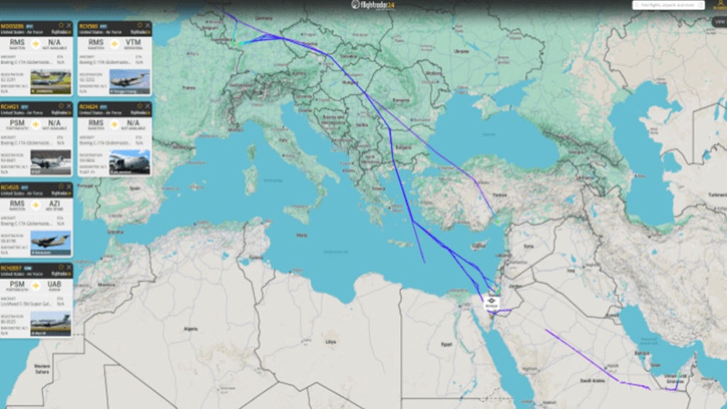 أنقرة (زمان التركية) – تواصل الولايات المتحدة الأمريكية تحشيداتها الجوية العسكرية من ألمانيا صوب الشرق الأوسط، حيث تم رصد 31 طائرة شحن على الأقل خلال الثمانية وأربعين ساعة الأخيرة.